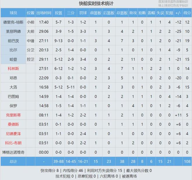 倫納德首發(fā)出戰(zhàn)29分鐘,投籃9中3,三分5中1,罰球3中3,得到10分4籃板2助攻1搶斷1蓋帽,正負值-25全場最低。哈登同樣首發(fā)出戰(zhàn)29分鐘,投籃12中5,三分9中2,罰球4中3,得到15分3籃板11助攻,正負值-21全場第二低。