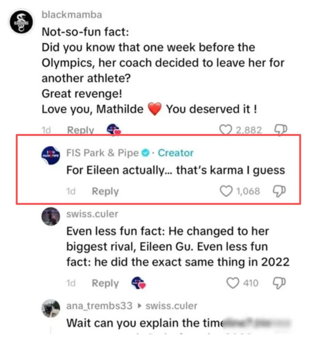 冬奧會期間,國際滑雪和單板滑雪聯(lián)合會(FIS)也踩過同樣的“雷”。FIS旗下官方TikTok賬號“FIS Park & Pipe”在一條關(guān)于瑞士選手瑪?shù)贍柕隆じ窭啄聤Z得女子坡面障礙技巧金牌的視頻評論區(qū),先有網(wǎng)友拋出所謂“不那么有趣的事實(shí)”,聲稱格雷莫德的教練在冬奧前一周“離開她去帶另一名運(yùn)動員”,并把奪金形容為“復(fù)仇”“是你應(yīng)得的”。該官方賬號隨后竟跟評稱:“對谷愛凌而言……我猜這就是所謂的‘因果報(bào)應(yīng)’?!卑压葠哿栉茨軍Z金輕飄飄地歸因?yàn)椤発arma”(常被理解為“現(xiàn)世報(bào)”)。事件引發(fā)外界強(qiáng)烈不滿后,相關(guān)評論被刪除;據(jù)報(bào)道,F(xiàn)IS也就此致歉。