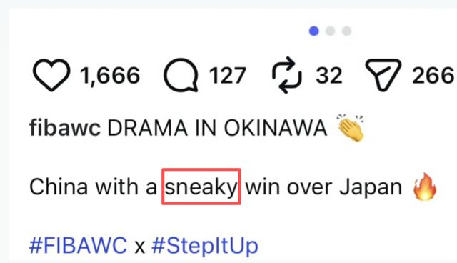 2月26日中國男籃在沖繩客場87比80逆轉(zhuǎn)日本隊(duì)后,F(xiàn)IBA籃球世界杯官方社媒賬號在戰(zhàn)報(bào)里寫下“China with a sneaky win over Japan”(“sneaky”在英語里帶著“鬼鬼祟祟、不光彩”的暗示,多家媒體譯作“偷走一場勝利”),隨即引發(fā)輿情。相關(guān)帖文隨后被刪除;2月27日,F(xiàn)IBA在其官方微信發(fā)布中英雙語致歉,明確向中國國家隊(duì)、中國球迷以及中國籃球界致歉,承認(rèn)措辭不妥,并強(qiáng)調(diào)中國隊(duì)勝利來自實(shí)力、拼搏與決心。