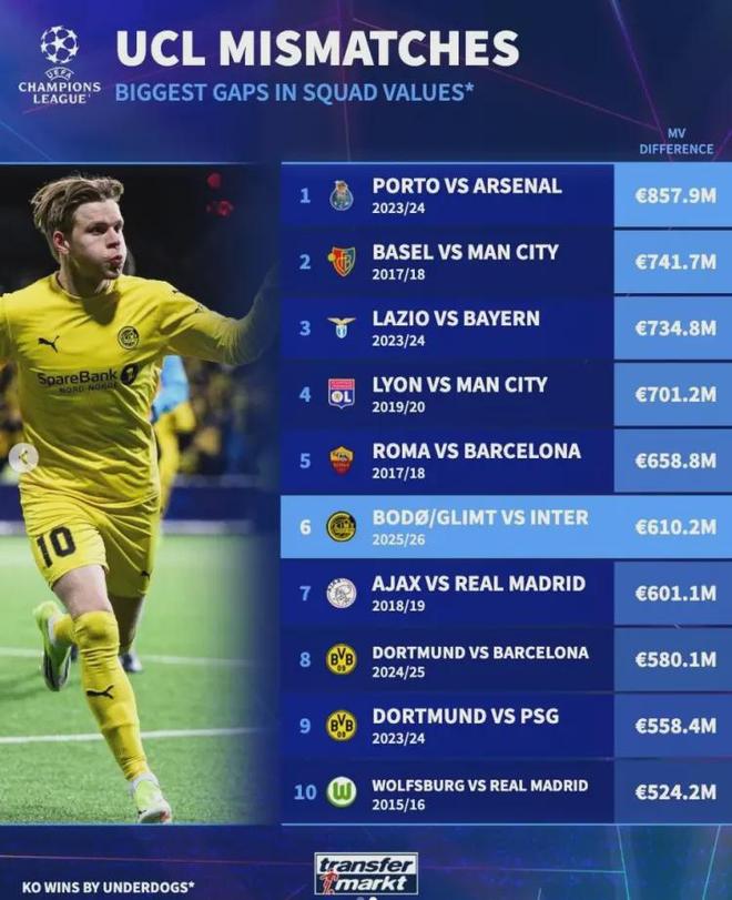 賽后數(shù)據(jù)刺眼得讓人心寒:國米全隊(duì)身價(jià)4.1億歐元,首發(fā)總身價(jià)更是高達(dá)數(shù)億,而博德閃耀全隊(duì)身價(jià)僅4260萬歐元。兩隊(duì)身價(jià)差高達(dá)6.1億歐元,這在歐冠歷史上足以排進(jìn)“以弱勝強(qiáng)”的前十名。